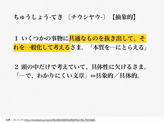 具体的な題材のこと。 ・ 「テーマ」とは 絵を描くという行為全体を貫く 中心的な主題のこと。 ・ 「コンセプト」とは 自分の価値観や興味の根底にある 抽象的な考えや視点を示す概念のこと。 例えば、 「私は 日本の美をテーマに 絵を描いています。特に 抽象的に考える というのは、 かなりの 初心者さんが見落としがちなので注意 ですね。 『抽象化と具体化をしっかり考えるうちに、 自然と「解決方法や行動内容」が観えてきます。 『自分が次に何をしたらよいのか』がはっきりしてくるん抽象ちゅうしょうabstraction 経験されたもののなかのある 特性 に注目してこれを取出し,ほかを捨てること。 同じ語が捨てられる特性についていわれるとき捨象と訳される。 スコラ哲学 は抽象を 重視 ,具体的な 個物 よりその類や種を引出すこと,質料